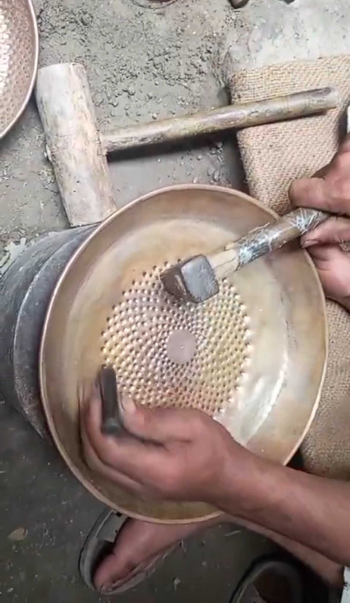 The hammering process involves placing metal—typically brass, copper, or iron—on an anvil or flat surface, then striking it with various types of hammers to shape, emboss, or texture the material. Depending on the desired outcome, artisans use different hammer sizes and types to create specific effects, like embossing patterns, flattening the metal, or giving it a textured finish. The art of hammering requires precision and control, as each strike must be carefully executed to avoid damaging the piece while achieving the intricate detailing.