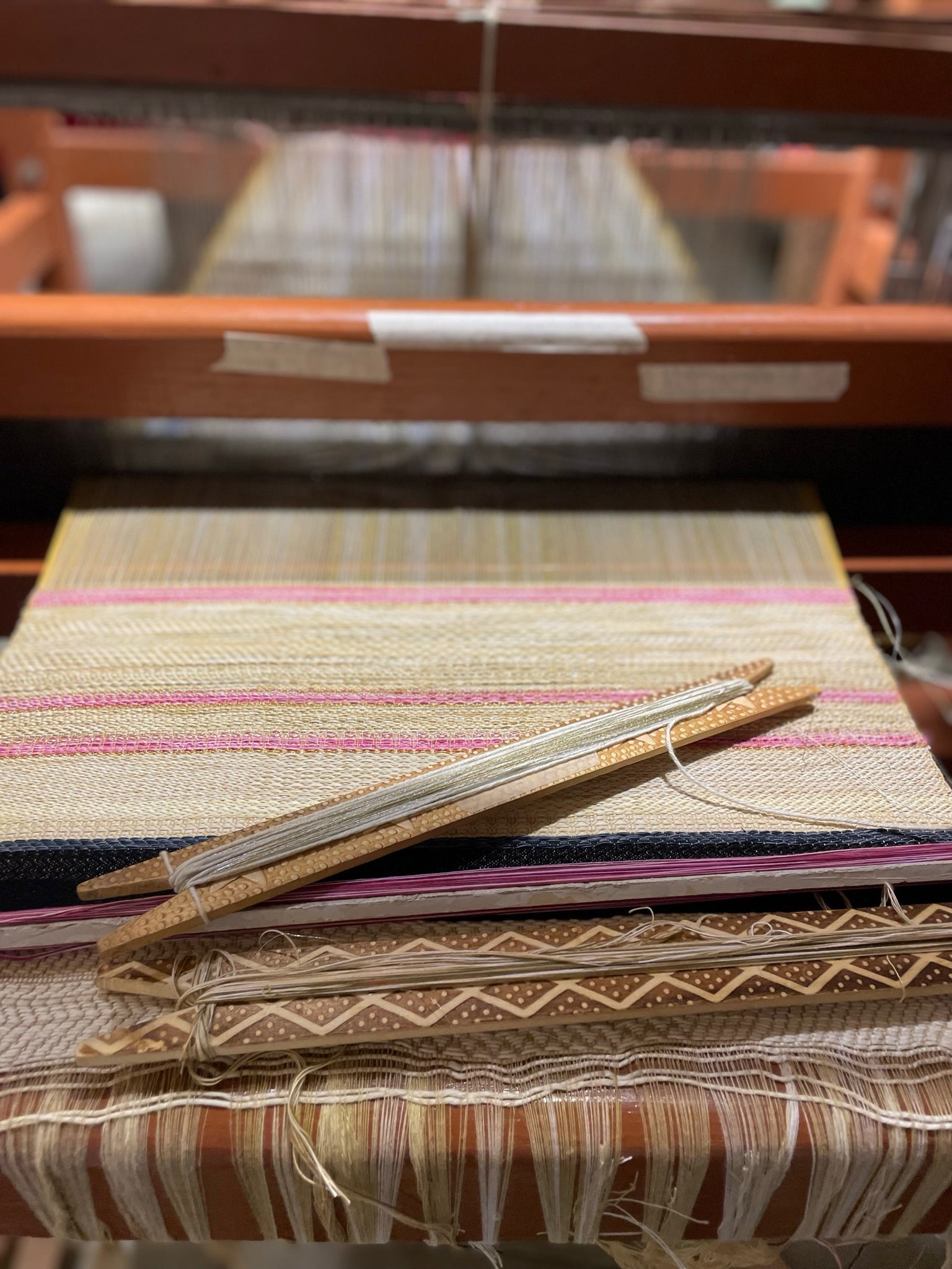 Using pedals, artisans move the weft threads through the warp, creating a pattern row by row. This process is highly rhythmic, with each motion building upon the last to form a cohesive, intricate design.