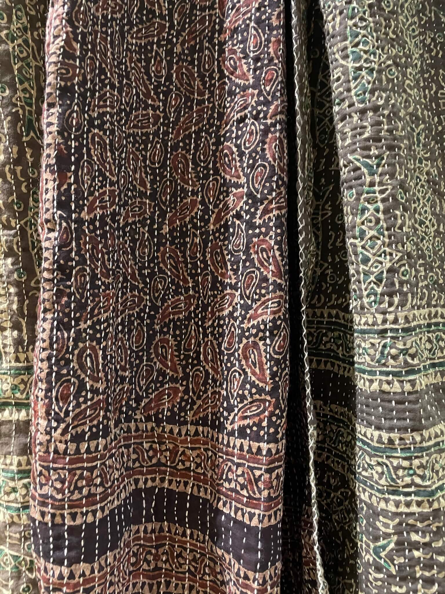 The signature feature of Kaantha is its running stitch embroidery. Artisans use this stitch to sew the layers of fabric together, while also creating intricate designs on the surface. The patterns range from floral to abstract motifs, with each artisan bringing their personal touch to the design.