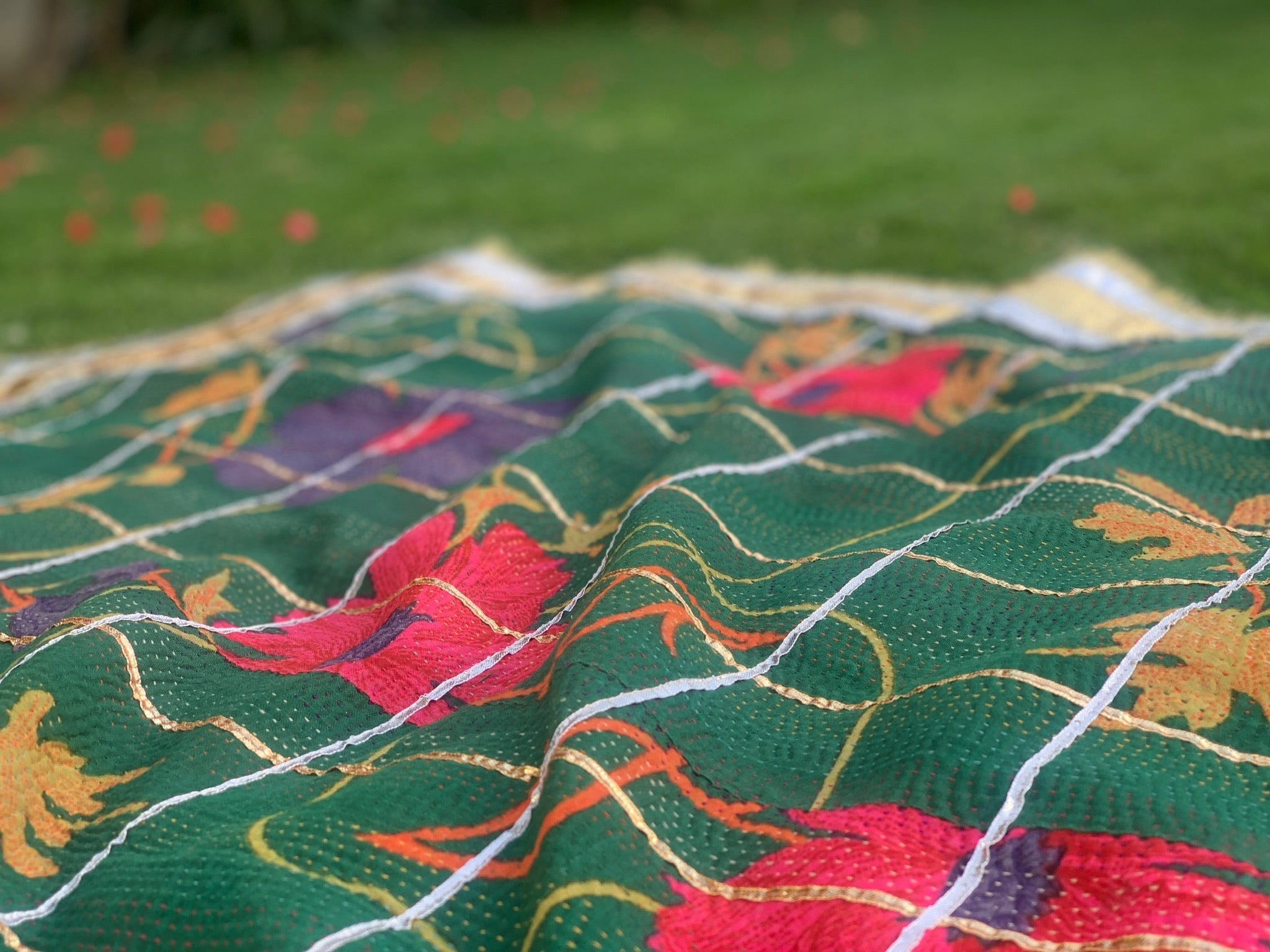 Kaantha is rooted in sustainability, as it originated as a way to repurpose old textiles. Traditionally, worn-out sarees and cloths were transformed into new items like blankets, cushions, and throws, showcasing the resourcefulness of rural artisans.