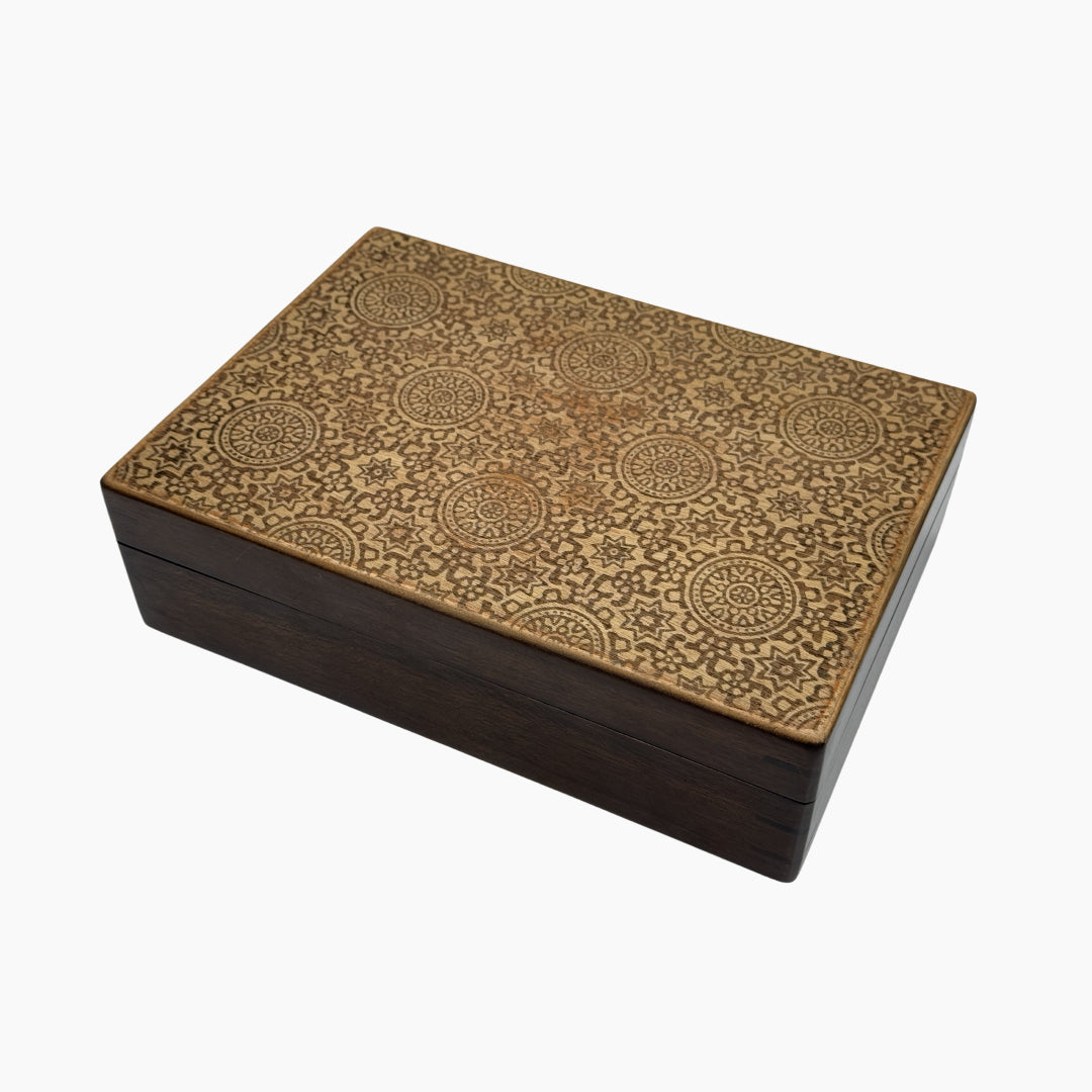 Handcrafted in wood, this box features laser-engraved Ajrak motifs inspired by Sindh’s traditional block prints. Perfect for keepsakes or jewellery.