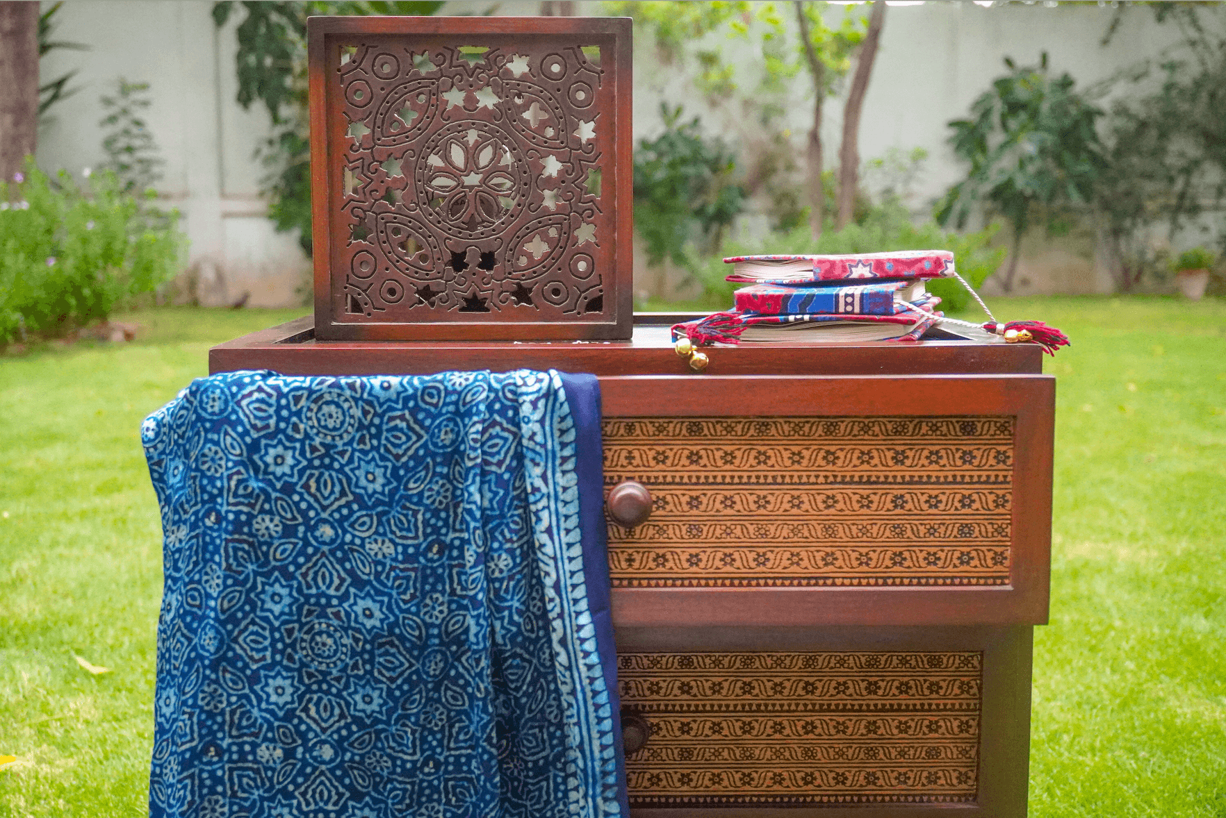 Illuminate your space with cultural charm using the Ajrak Carved Wooden Lamp. Made from high-quality wood, this lamp showcases intricate Ajrak patterns inspired by Sindh’s heritage, casting beautiful light and shadow.