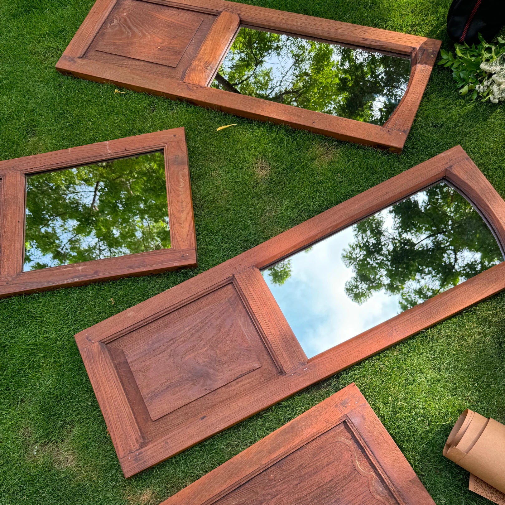 Century old teak windows repurposed to make mirrors. These antique pieces are one-of-a-kind finds from old Havelis in interior Sindh. Some still carry the the original hardware and marks of the storms they weathered.